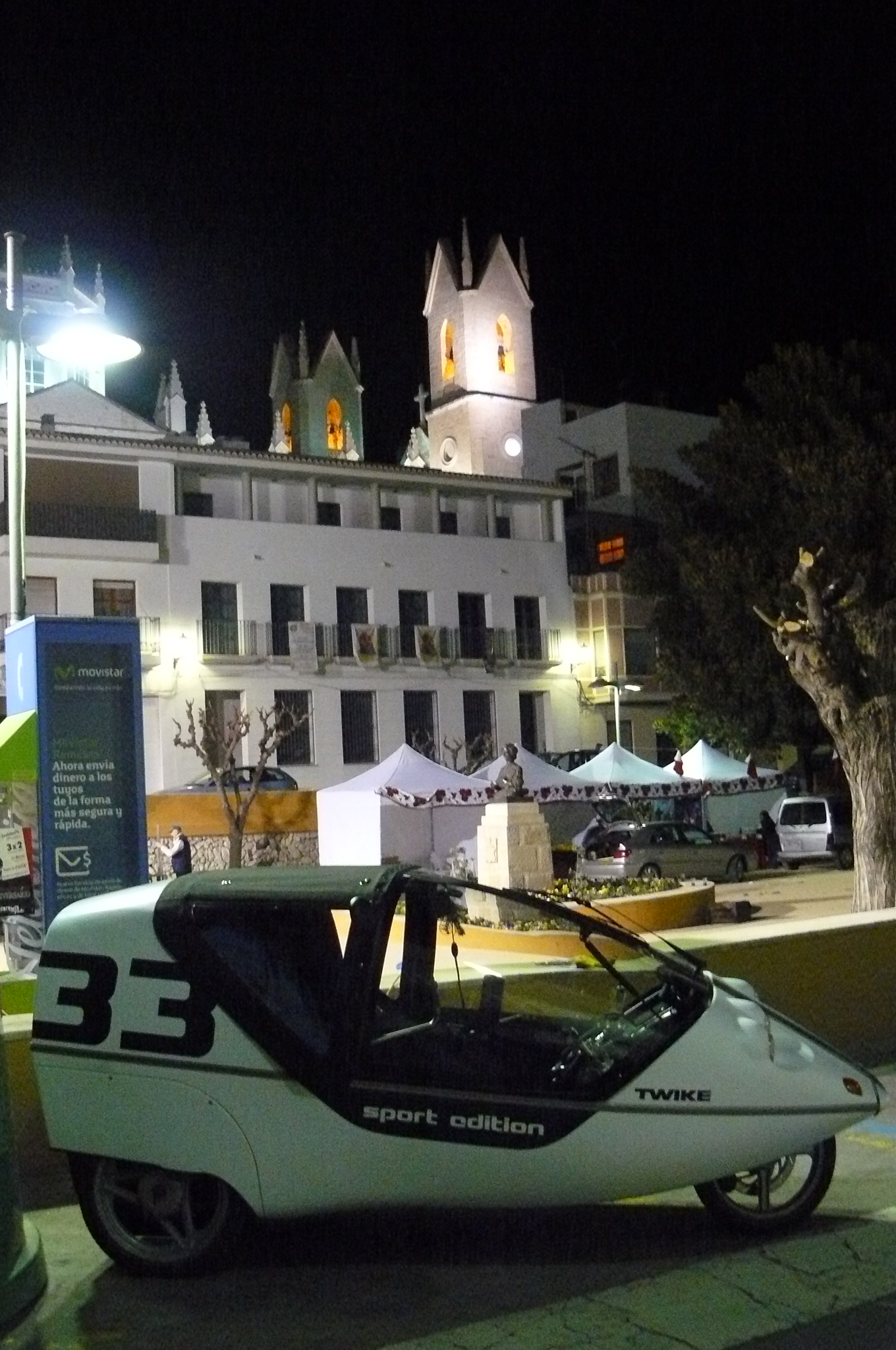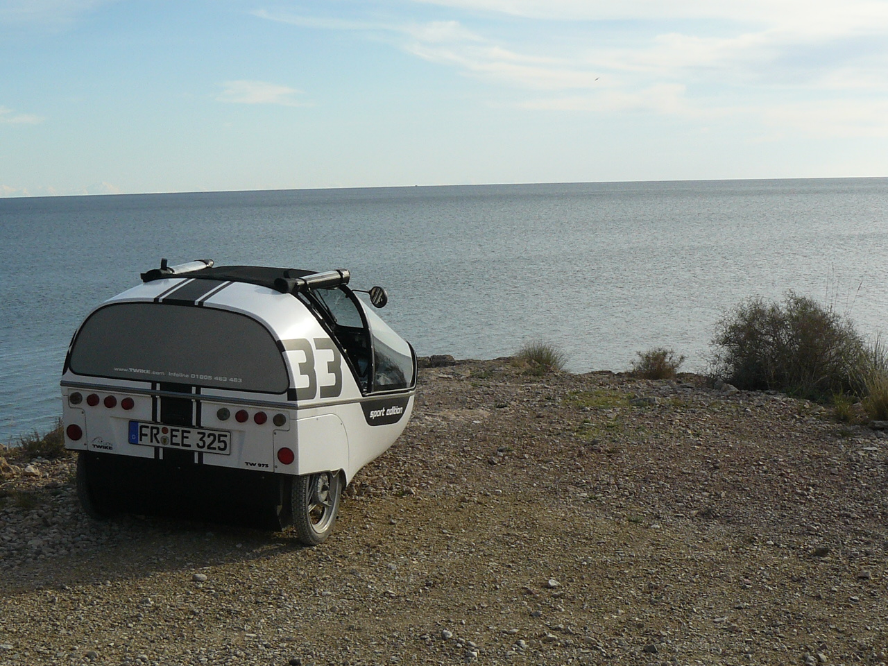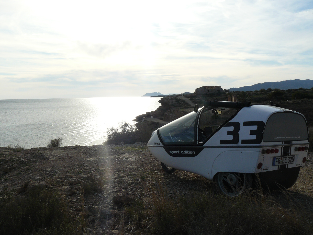 Ich fuhr von der Autobahn ab. Eine Tankstelle mit Aussensteckdose musste her…in der nächsten Ortschaft erschien eine…und glech mit zwei Steckdosen!!! Ich war in der Zwischenzeit auf 0km to go jedoch noch mit 330V unterwegs…eine Absage!!!! Denn an den Steckdosen hingen kleine Weihnachstsbeleuchtungen…..um halb 3 Uhr morgens….etwas schockiert wegen dem Missverständniss meiner Notlage blickte ich zu Barbara….welche friedlich im Twike schlief….in dem Moment kam der Parkplatzwächter, erkannte die Lage und nahm mich kurzentschlossen mit zu einem LKWstromstecker auf seinem Parkplatz….wir kamen hierbei zu 3h Schlaf und pünktlich nach der Volladung fuhr ich dem Sonnenaufgang in Cartagena entgegen.