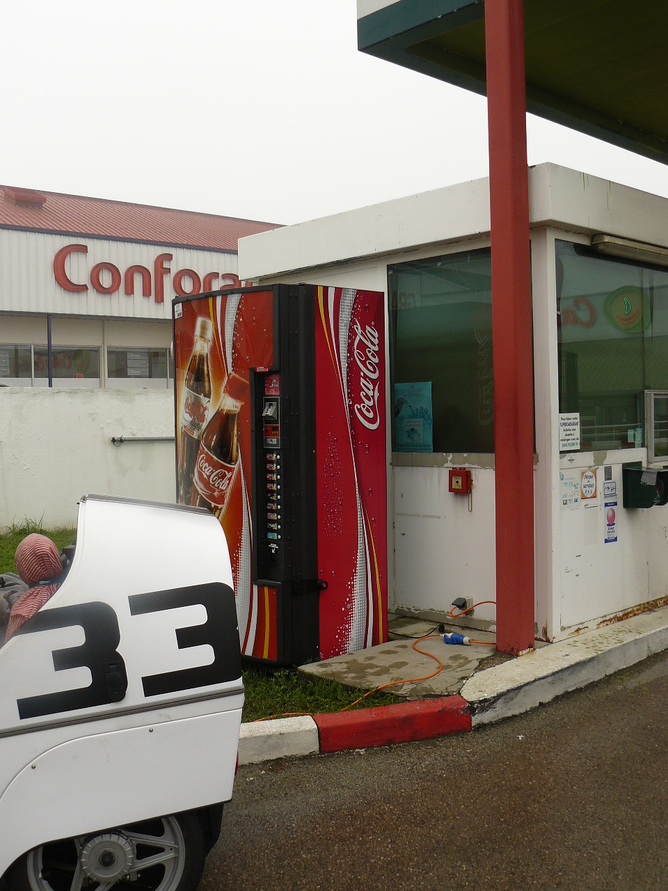 Die ganze Suchaktion hat mich fast 2h gekostet….als ich gerade einsteigen wollte, befragten mich ein sehr am Twike interessiertes junges Paar über mein Fortbewegungsmittel aus…ich konnte es mir nicht verkneifen zu sagen, das alles noch so toll sein kann, wenn ich aber kein Strom finde, bringt mir das alles nichts. Sie konnten es nicht glauben, dass es in diesem Riesencenter nicht eine einzige Steckdose für mich gab. Der Mann machte sich auf, um ebenfalls nochmals nachzufragen. Er kam zurück und meinte, er hätte einen Dosenautomaten entdeckt…mit Steckdose…ein kurzer Blick…und ich Schritt zur Tat über: