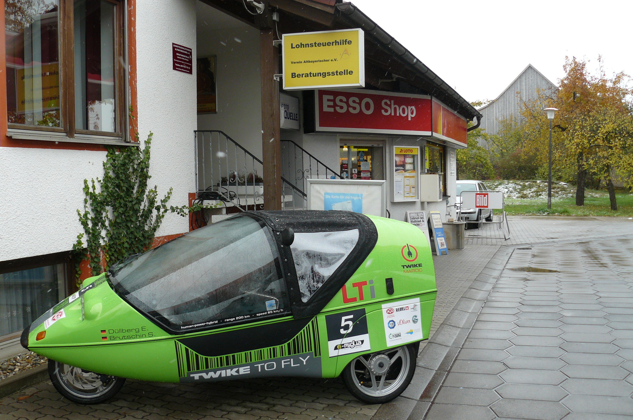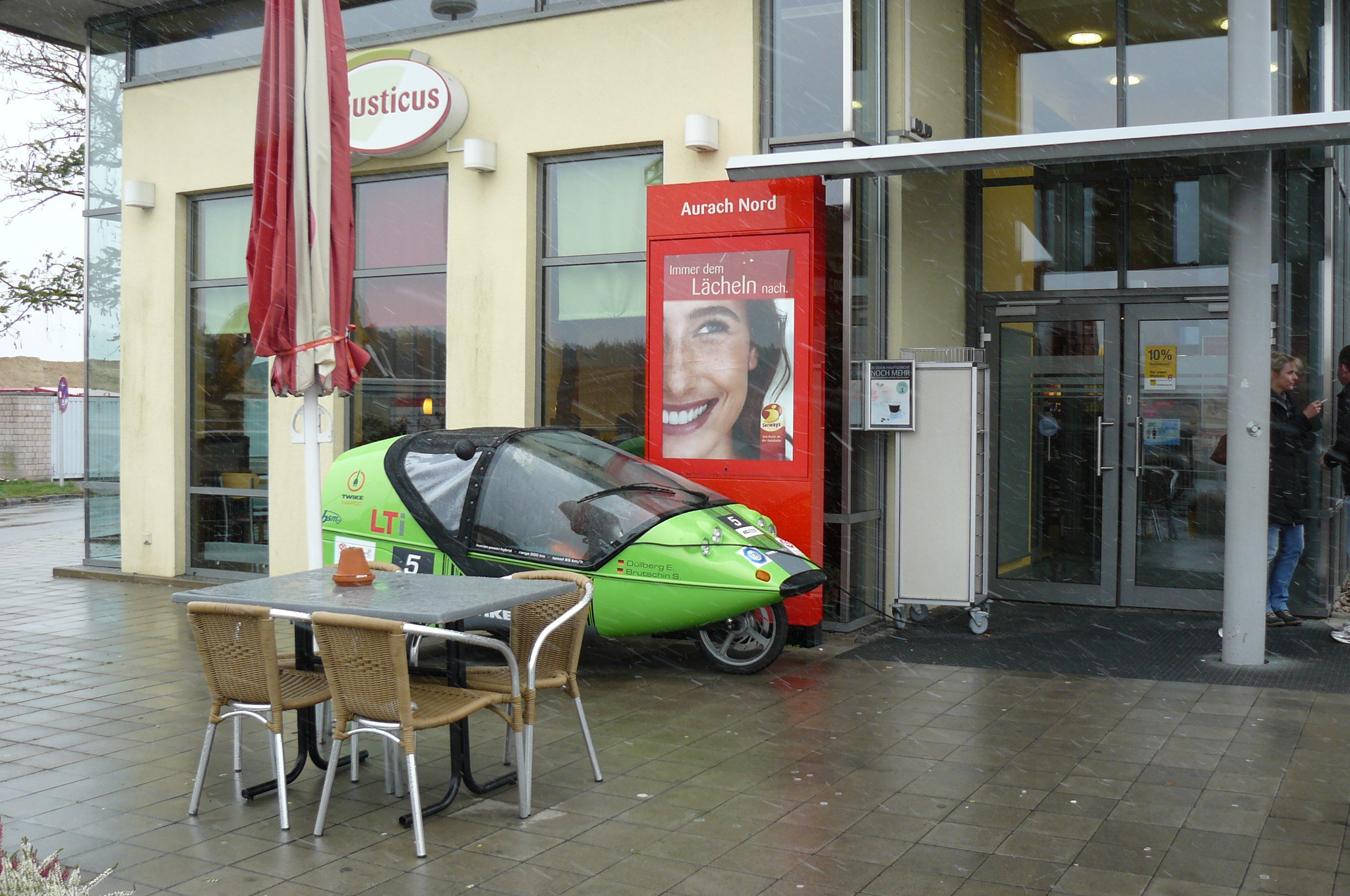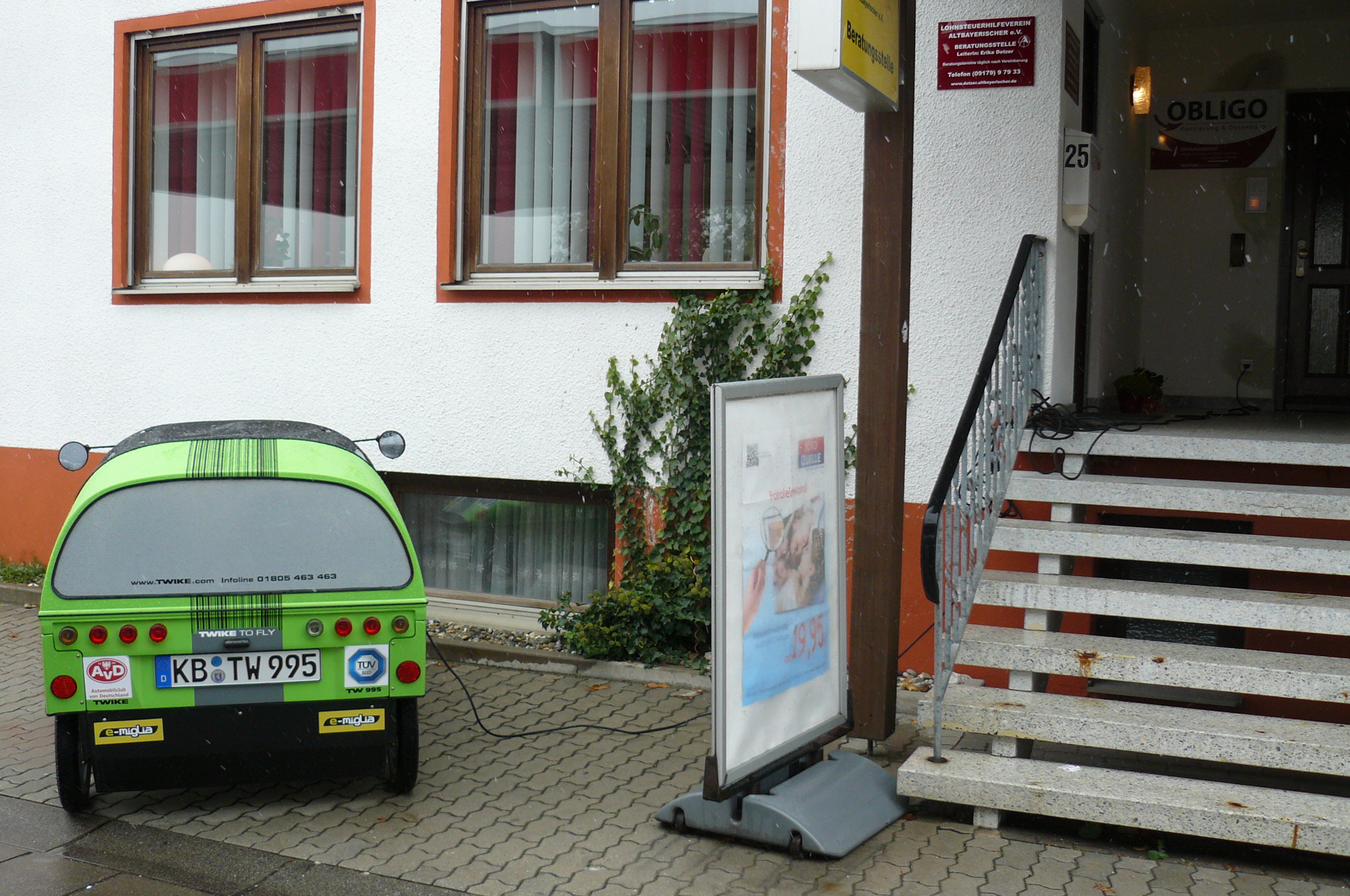 Ganz aktuell ist TWIKE ZORA II gerade kurz vor Nürnberg beim Laden zu entdecken. Die Farbe grün hat sich mittlerweile in eine weisse Schneefarbe verwandelt.