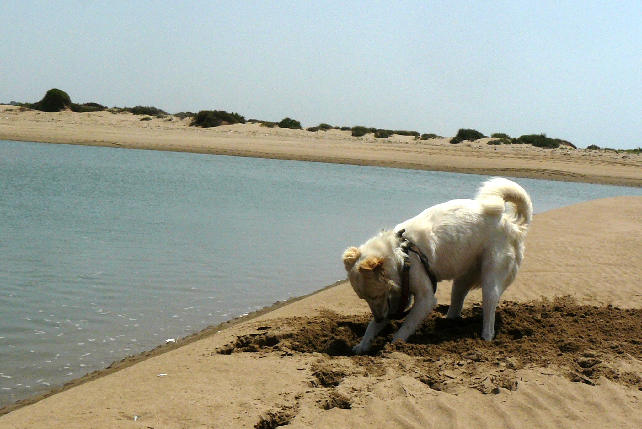 Sie hat Angst und macht sich im wahrsten Sinne erst mal in die Hosen. Die Bescherung im TWIKE hielt sich in Grenzen, doch müssen wir aufpassen, dass durch die Lücken im TWIKE die Batterien keine Flüssigkeit abbekommen. Die Parkplatzwächter kennen Bayda und Dalmatinerpfote bereits und freuen sich über Sable. Ihr wird erst mal Wasser angeboten. Sie verzichtet. Ausserdem läuft sie nicht. Wir tragen sie zum Strand und geben ihr viel Zeit. Sie taut auf. Anschliessend läuft sie uns hinterher und weicht nicht von unserer Seite.