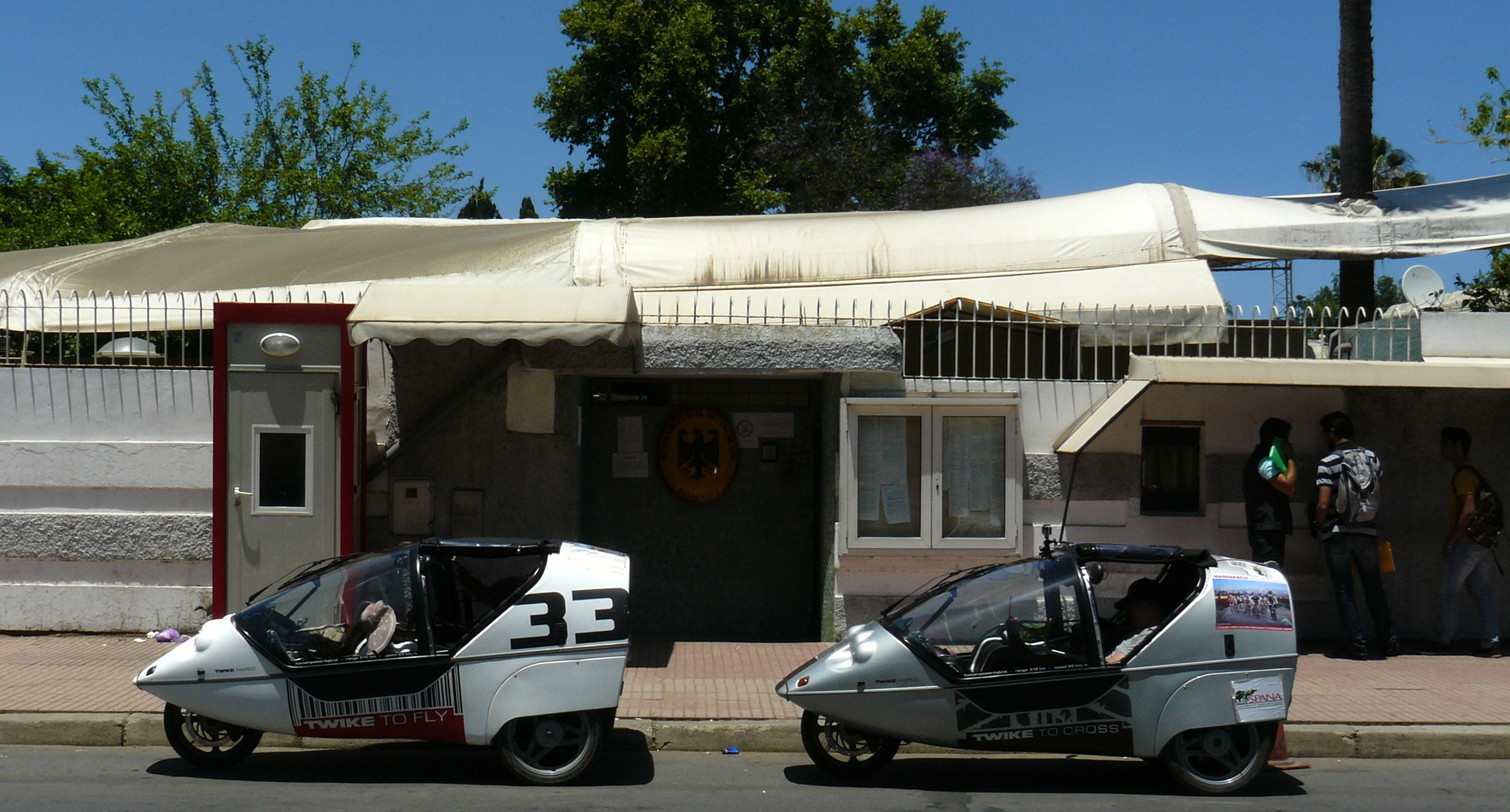 Wir versuchen es. Der Zöllner sagt uns, dass er die Ausfuhr nicht bestätigen kann, da das Ausfuhrdatum nicht stimmt. Da hat er recht, da wir von Marokko eine interne Verlängerung erhalten haben. Jedoch erklärte uns der Zoll in Agadir, dass diese die Verlängerung nicht auf unser Carnet übertragen können, dafür wäre schliesslich Tanger zuständig. Warum Tanger? Ganz einfach, da diese die Einfuhr bestätigt hatten. Ganz einfach? Nein, da Tanger sagt, dass sie hierüber nicht Bescheid wissen. Wirklich nicht? Seltsam, denn die kleinen grünen Fahrzeugzettel, welche jedes Fahrzeug von der Polizei erhält, wurden doch bereits von Agadir ebenfalls verlängert. Fahrzeuggestellnummer etc. alles identisch. Argh, wir waren doch in Eile. Mittlerweile unterhielten wir uns doch „zwangsmäßig“ über Gott und die Welt. Unter anderem war ein Gesprächsthema die Unveränderlichkeit der arabischen Sprache. Wir hatten keine Wahl. Die Zeit drängt doch mussten wir den Plausch mitmachen. Und schlussendlich bekamen wir dann doch unseren Stempel.