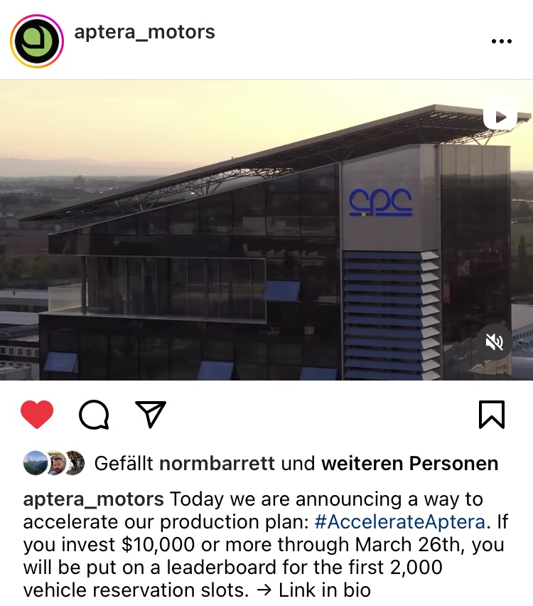 Aptera versucht es nun ähnlich wie TWIKE und Sono Motors: Die Bitte die Anzahlung zu erhöhen. Ob es funktioniert?