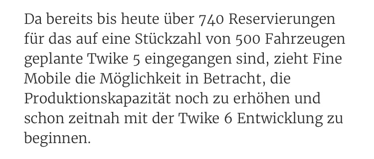 Gehen wir mal davon aus, dass die 500 TWIKE 5 Anwärter durch Aufstockungen Ihrer Anzahlungen bis zum 1.April die 600.000 Euro erreichen. Wie lange wird dann benötigt bis zur Fertigstellung des Prototypen? Der SOP ist bereits für Spätsommer 2023 angekündigt, das wäre Ende Juli, vier Monate nachdem der Prototyp fertiggebaut werden kann. Gehen wir davon aus, dass der Prototyp innerhalb eines Monats gebaut werden kann. Dann wären wir bei Anfang Mai und bis zum SOP blieben lediglich noch drei Monate. Sportlich. Denn bis dahin braucht es auch noch weitere Mitarbeiter um auch wirklich zwei Fahrzeuge täglich zu produzieren. Diese müssen finanziert werden, Material eingekauft werden etc. Kurzum, die fehlenden 6 Millionen Euro für den SOP müssten dann innerhalb von drei Monaten eingesammelt werden. Sportlich.