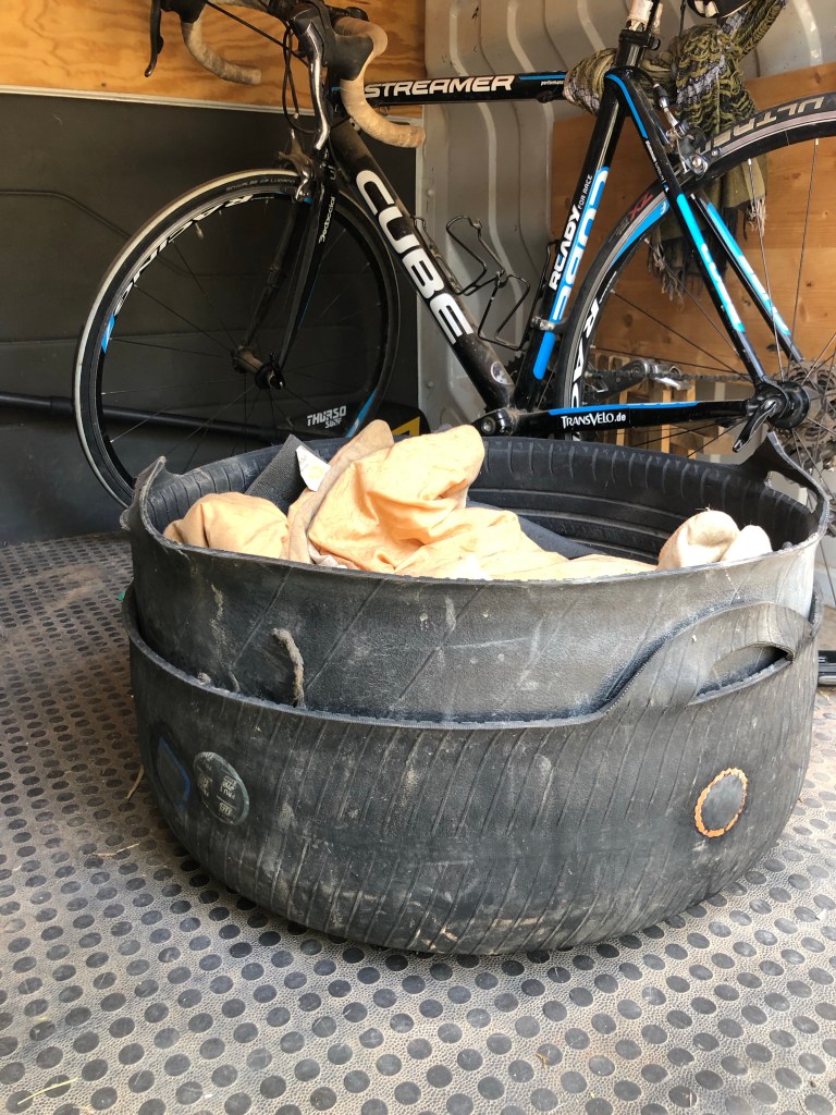 Billies Körbchen fährt mit. Souky fühlt sich ganz wohl in seinem neuen vorübergehenden „Hochsitz“.
