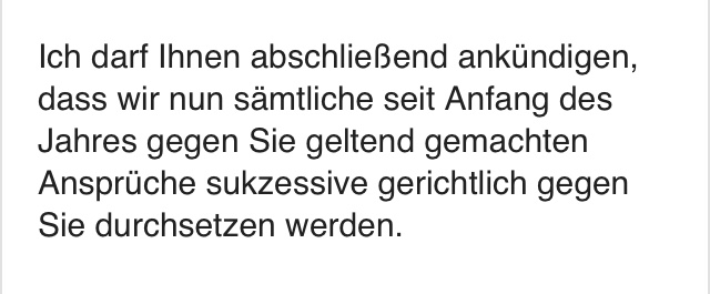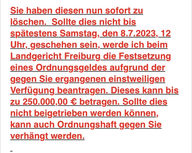 Und nein, das ist immer noch kein von mir initierter Rechtsstreit. Es ist das 5. Mal, dass ich mich verteidigen muss. Zuvor habe ich mich bereits 4 Mal erfolgreich verteidigt. Jeder versuchte Prozess gegen mich wurde eingestellt. Auf den Anwaltskosten blieb ich allerdings sitzen.