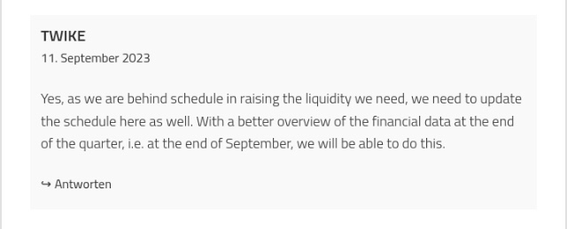 Es sind mal wieder die Finanzen. Nur knapp 200 Vorbesteller haben erst 20.000 Euro anbezahlt. Das reicht bei Weitem nicht aus. Deshalb gab es Ende August einen Live-Chat, den jedoch leider nur knapp 80 Personen zu dem Zeitpunkt angeschaut haben. Trotz anscheinend weiterhin mangelnden Interesses (selbst beim TWIKE 6 sind es noch nicht einmal 2000 Interessenten auf die geplante Anzahl an 10.000 TWIKE 6), wird weiterhin darauf gehofft, dass weitere 300 Reservierer auf 20.000 Euro aufstocken.