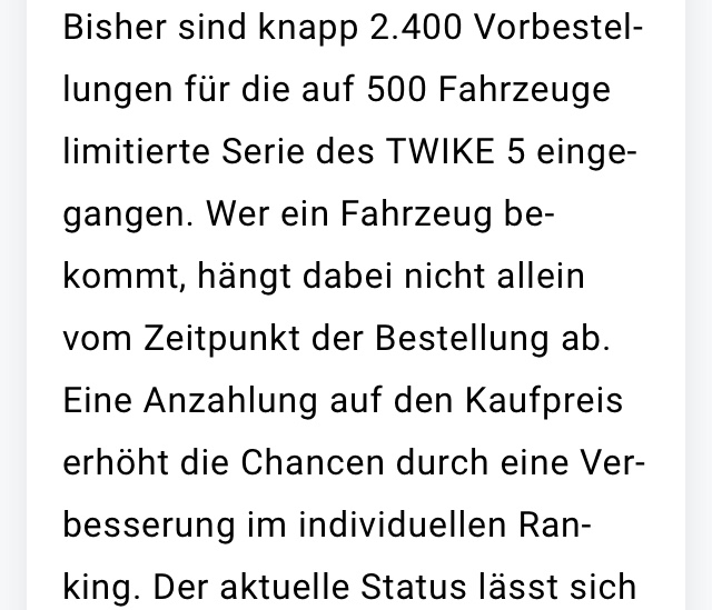 Einspruch! Es sind lediglich 140 0-Euro Reservierungen für ein TWIKE 5 und somit 1900 0-Euro Reservierungen für ein TWIKE 6. Bitte fair und korrekt bleiben! Auch wenn der finanzielle Druck vorhanden ist!