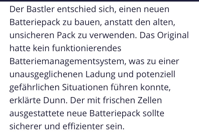 Auch interessant zu wissen: Es besteht wohl die Möglichkeit Batterien des Tesla 3 zu verwenden und somit die Reichweite zu verdoppeln. Das würde ich gerne machen, wenn ich endlich das noch ausstehende Gehalt ausbezahlt bekäme.