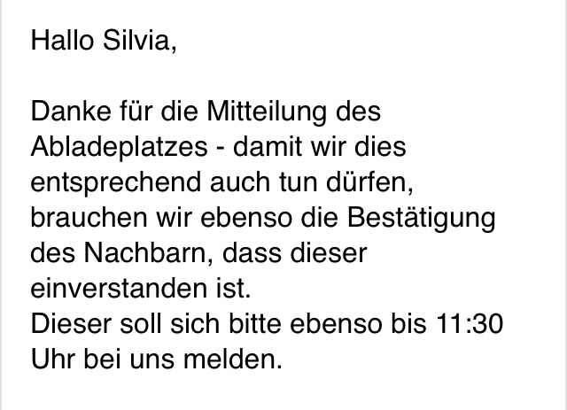 Denn eine Abholung auf dem Firmengrundstück wäre nicht erwünscht!!! Warum einfach, wenn es auch kompliziert und zeitaufwendig geht!!!