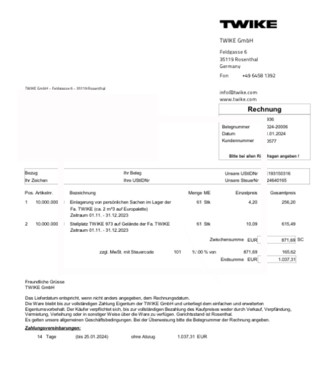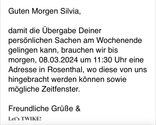 Also gab ich meine Zustimmung zur Abholung meiner persönlichen Dinge UND meinem TWIKE.