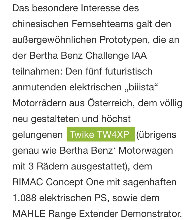Ich finde es toll, wenn die leider immer noch sehr geringe Anzahl an TWIKE Piloten auf sich und ihr historisches Fahrzeug aufmerksam machen. Es passt zur Bertha Benz! Und schauen wir mal, vielleicht ist ja sogar eine TWIKE Pilotin anwesend 🙂