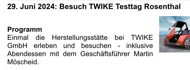 Als TWIKE Klub Mitglied möchte ich auf keinen Fall nervt das Prozedere miterleben wie ich das mit der letztjährigen TWIKE Besichtigung miterleben durfte. Diese wurde vom Emobil Club Marburg organisiert und da ich dort engagiert bin kam es wohl zu einem Interessenskonflikt bezüglich meiner Person, welcher sogar vor Gericht landete.