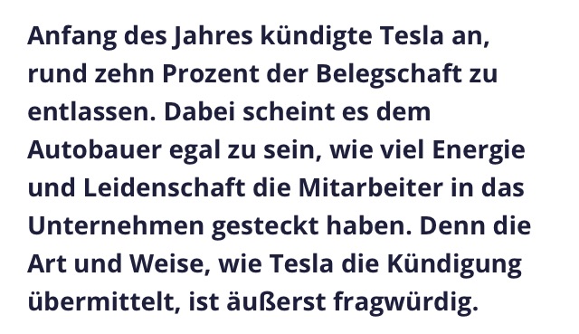 Mittlerweile kann ich ja bereits wieder leicht Schmunzeln. Immer wieder kam mir beim Lesen des Artikels der folgende Spruch von TWIKE Geschäftsführer Martin Möscheid in den Kopf: Wir richten uns nach Tesla. Klare Webseite, keine Werbung etc. Leider konnte ich aber nie das Referral Prinzip von Tesla bei TWIKE durchsetzen. Dabei fallen mir aber nun immer mehr Parallelen in Mitarbeiterführung und deren Entlassungen (Plural beabsichtigt) auf. Leider!