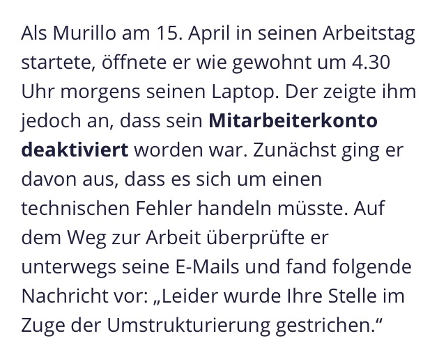 Anbei nochmal eine Kurzzusammenfassung. Ein Mitarbeiter hat mir während eines Hundespaziergangs und eines Austausches mit der Schwester des Geschäftsführers einen Umschlag überreicht. Ich dachte mir nichts dabei und öffnete diesen erst einige Stunden später. Hier lag dann die Kündigung drin. Ein 1.5 Zeiler. Laut Gewerkschaft die kürzeste Kündigung, die sie je gesehen hatten. Ich dachte, da ist der neuen Sekretärin aber ein gewaltiger Fehler passiert. Der Geschäftsführer war bei meinem Eintreffen am Telefonieren. Als ich ihn darauf ansprechen wollte nach dem Gespräch ist er ganz schnell weggegangen und hat unserer Sekretärin per Mail ausrichten lassen, dass er später auf mich zukomme. Zwei Jahre später habe ich immer noch keine Rückmeldung. Vor Gericht ist ebenfalls von seiner Seite das Wort der Restrukturierung gefallen. Es macht aber überhaupt keinen Sinn während einer sehr kritischen finanziellen Situation den Posten der Kommunikation und Marketings zu streichen. Das Ergebnis ist nun nach zwei Jahren ohne Kommunikationsposten deutlich zu erkennen. Karma? Oder einfach nur rational nachvollziehbar, da an falscher Stelle gespart.