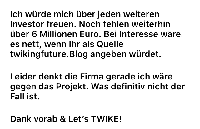 Falls Du bereits ein Investor bist, aber das zweite Crowdinvest nicht unterstützt hast, dann kannst Du somit nett bei der TWIKE GmbH nachfragen.
