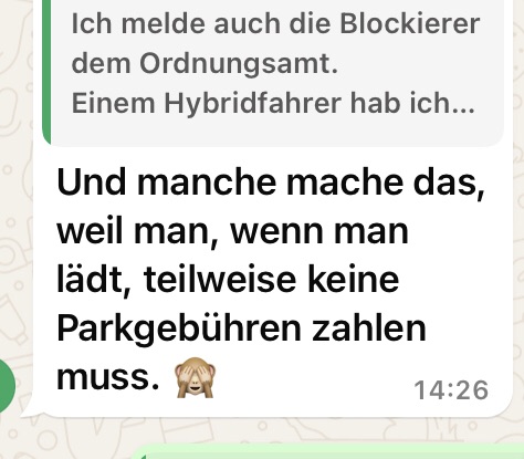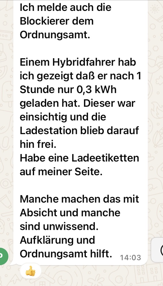 Noch dreister sind leider einige Hybridfahrer, welche sich überhaupt nicht an die maximale Parkzeit richten. Natürlich ist ein Hybridfahrzeug in 1.5h nicht im Ansatz an voll geladen. Wie dreist ist es dann über 4h zu laden und nicht mal anwesend zu sein, keine Telefonnummer anzugeben etc.
