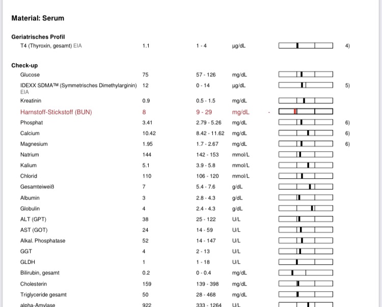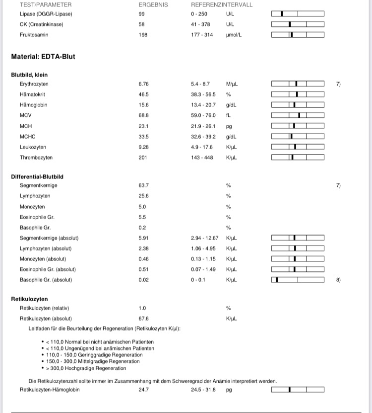Alle Werte gut in der Norm bis auf Schilddrüse und Harn. Harn ist wohl nicht so wichtig, doch Schilddrüse muss im Blick behalten werden, da diese sich auch bemerktbar macht, wenn anderes im Körper nicht stimmt.