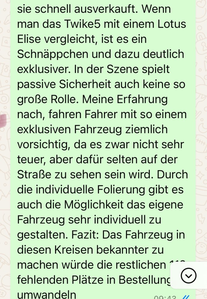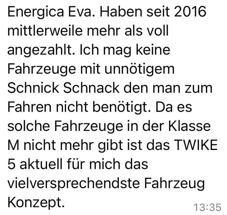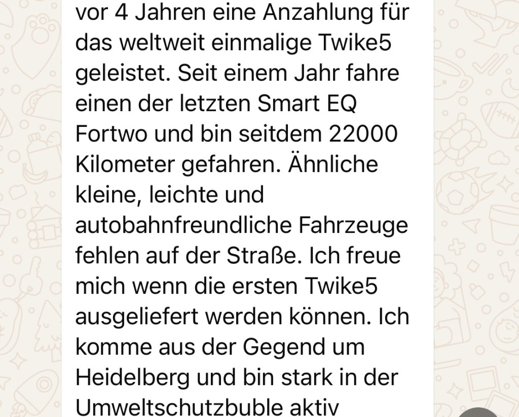 Unter anderem der „neue Kundenvertreter.Eigene Anmerkung: In der Tat ist ein ungewisser Start Of Production (SOP) auch für potentielle Anzahler ein Knackpunkt.Eigene Anmerkung: Richtig so! Teilanzahlung, welche man persönlich auch als Verlust verkraften könnte, plus Geduld.Eigene Anmerkung: Gute Einstellung.Eigene Anmerkung: Passender TWIKE 5 Anwärter.Eigene Anmerkung: Ein TWIKE Interessent wollte ebenfalls in die „Ideengruppe zur Finanzierung des TWIKE 5. Bevor sich diese Person wohl vorstellen konnte, ist diese ohne Begründung entfernt worden.