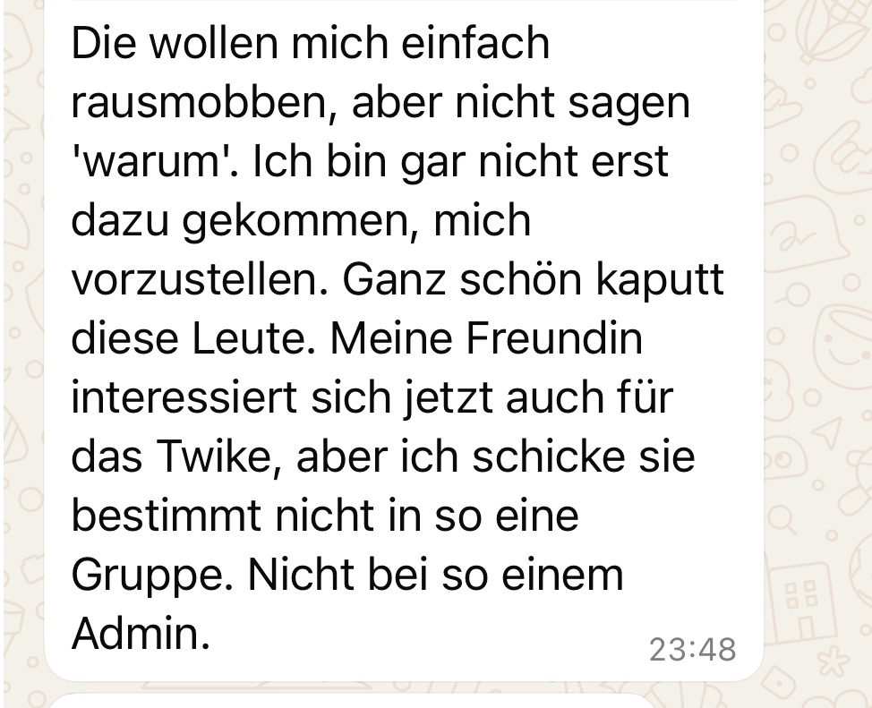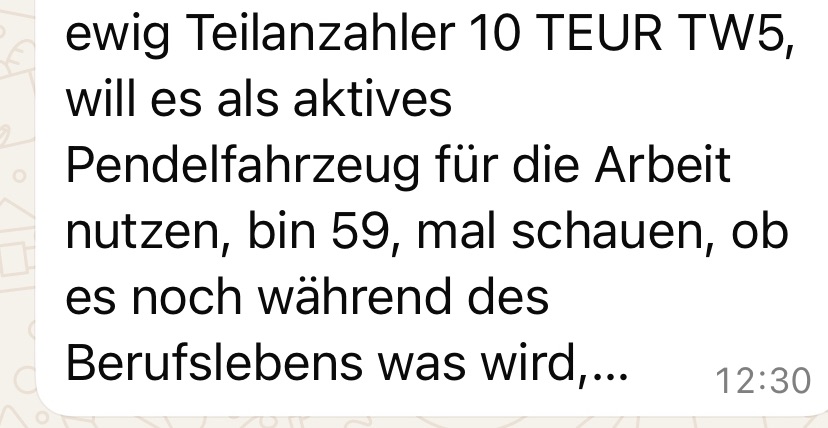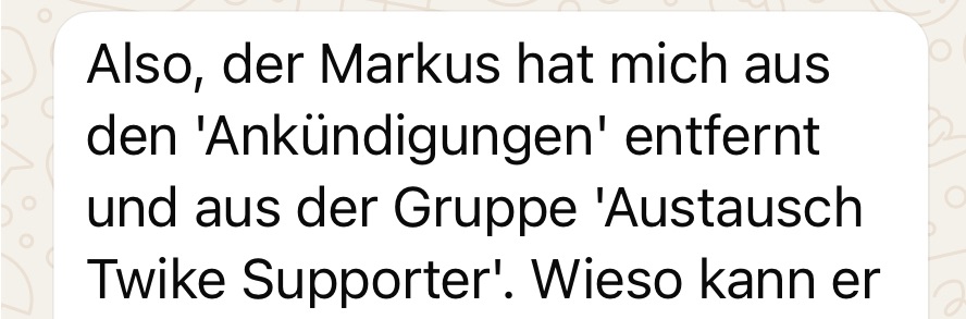 Nach letzteren Info dachte ich mir, jetzt müsste ich was schreiben. Doch die Gruppenregeln sagten strikt nur Vorstellung und TWIKE 5 Finanzierung. Somit erwähnte ich diesen Vorfall lediglich in einer anderen TWIKE Gruppe und dann war es ok für mich. Sollen sich doch andere ebenfalls ein Bild machen über den „neuen (selbsternannten ?) Kundenvertreter. Manchmal ist es dann doch besser zu schweigen.