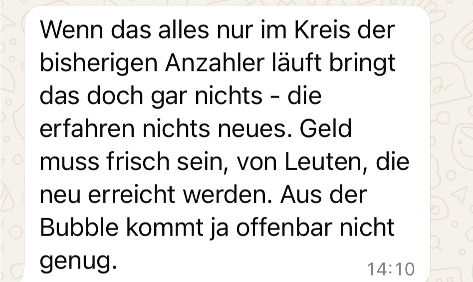 Es lief nur zögerlich an. Die YouTube engagierte Person versucht auszuhelfen und wirbt in mind. einer anderen Gruppe, wo der neue Gruppenersteller nicht mehr erwünscht ist für diese neue fokussierte Gruppe. Ich fand es ist ein Versuch wert, auch wenn sich wohl nur die Spreu vom Weizen getrennt hat. Ca. 30 Prozent fühlten sich allerdings angesprochen.