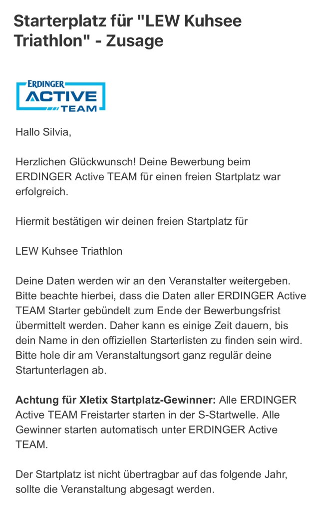 Heute kam bereits die erste Zusage! Die Teilnahme an einem Triathlon im Juli!