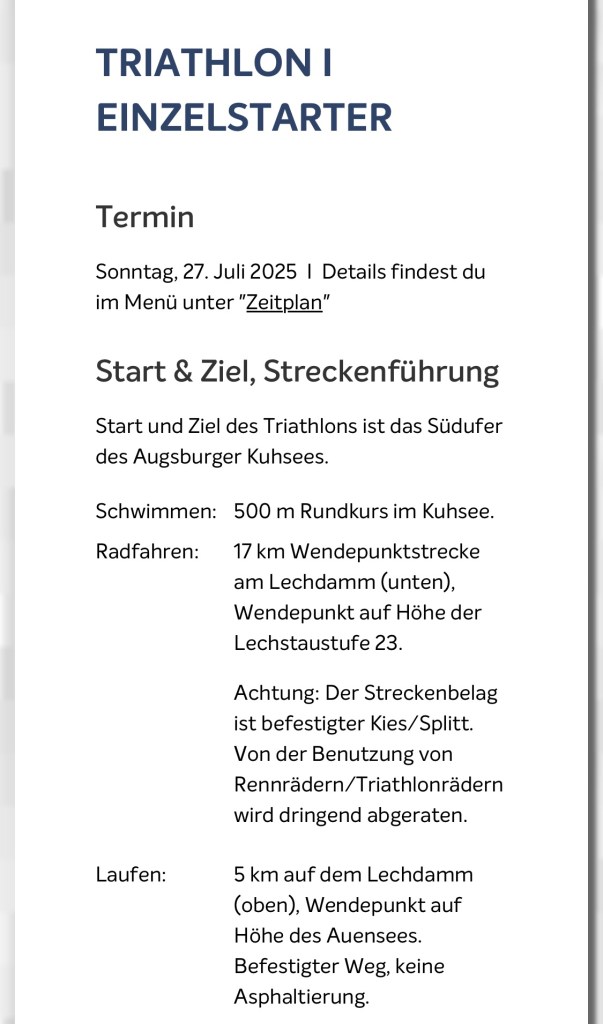 Lucky me, mein bisher kleinster Triathlon mit 500 m Schwimmen, 17 km Radeln (kein Rennrad) und 5 km Laufen (unbefestigte Wege, somit wird es wohl kein Barfusslauf, sondern eher ein Sandalenlauf werden).