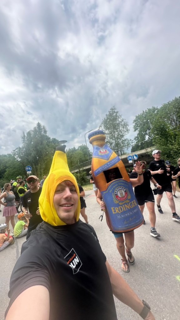 Die Reaktionen? Unfassbar! Schon vor dem Start wurden Selfies gemacht, gelacht und gejubelt. Während des Laufs hatte ich das Gefühl, halb München sei Mitglied im ERDINGER-Fanclub. Was für ein geniales Guerilla-Marketing! Die Flasche kam einfach super an – bei Zuschauer:innen und bei den Mitläufer:innen.
