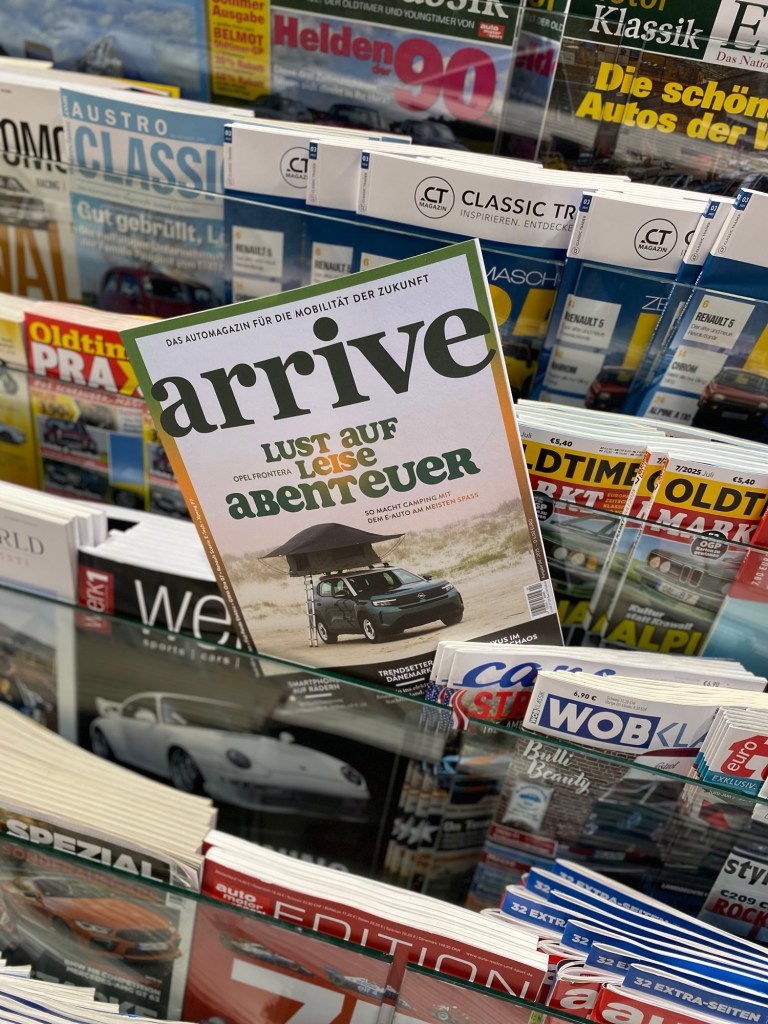 Während ich wartete, entdeckte ich in einem kleinen Bahnhofskiosk das neue Arrive-Magazin – die Ausgabe mit meiner elektrischen Reise nach Dakar. Drei Wochen nach Veröffentlichung hielt ich endlich die Printversion in der Hand.