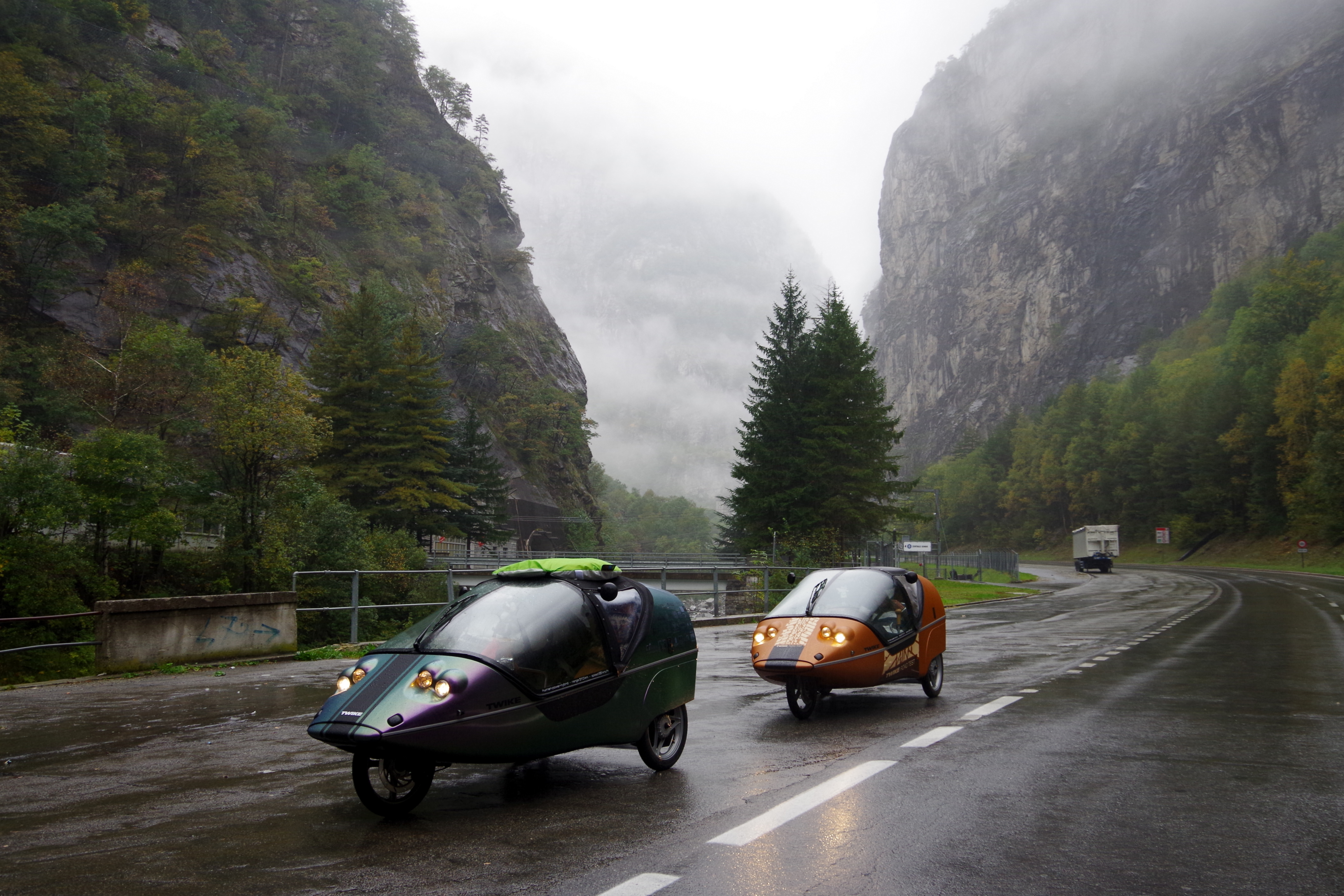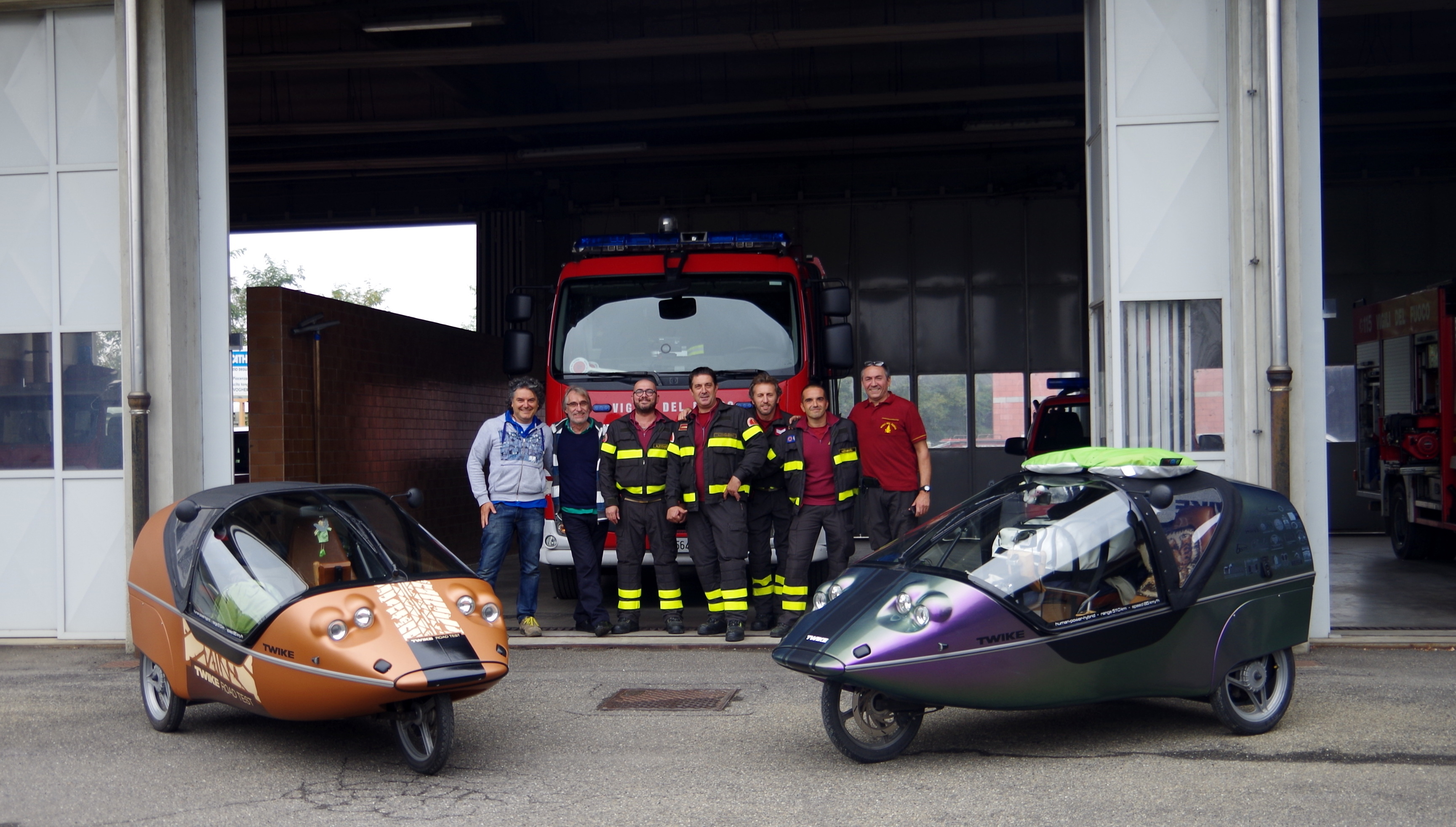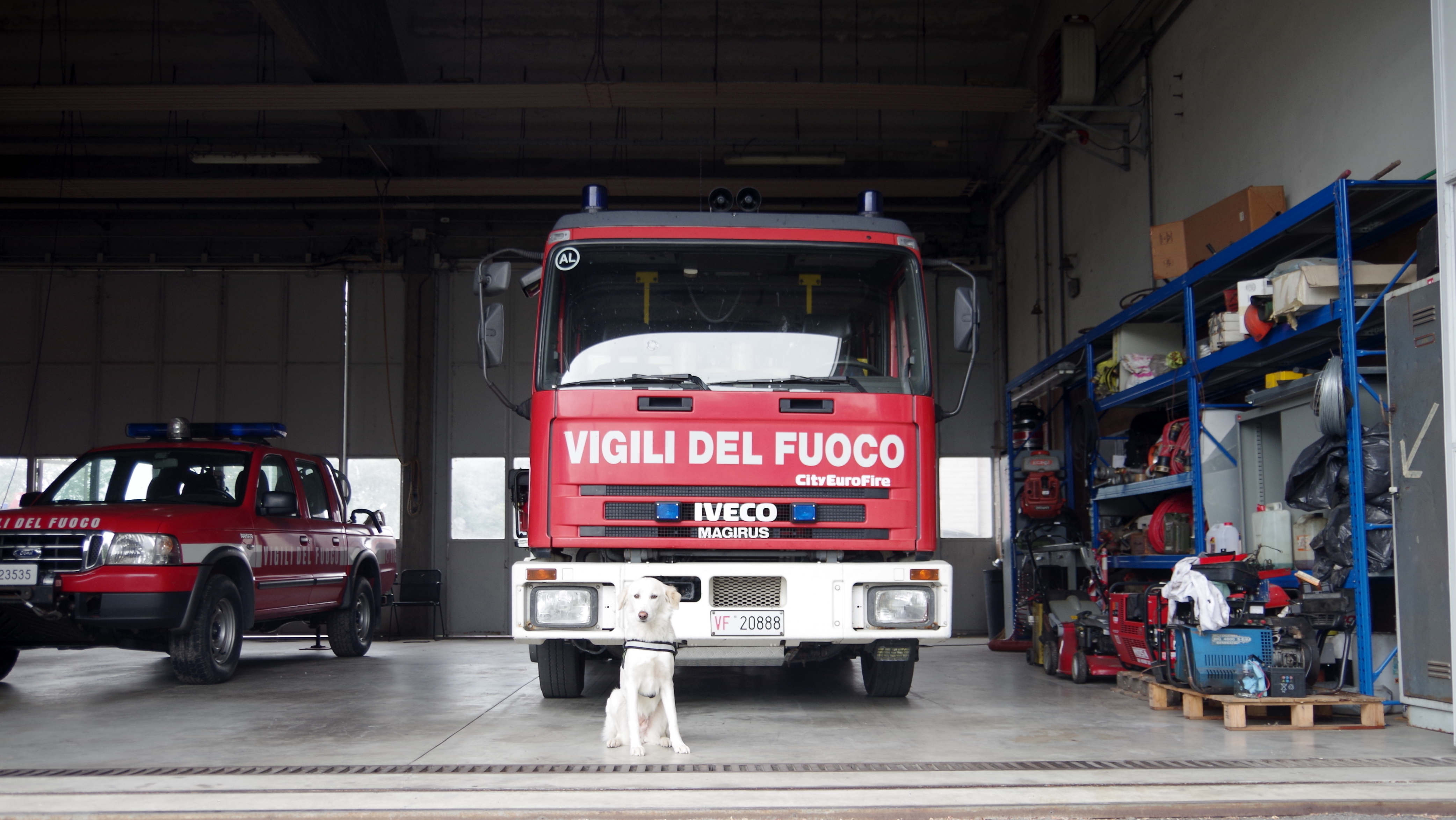 Unser erster Ladestopp wird gesucht. Für Italien glänzen diverse „Ladesäulensuchseiten“ wie Chargemap und Lemnet mit deren Abwesenheit. Sehr wahrscheinlich gibt es einfach kaum öffentliche Lademöglichkeiten. Erschwerend kommt hinzu, dass wir nicht an einen italienischen Adapter gedacht haben (der Schweizer war natürlich im Gepäck, haben wir jedoch nicht gebraucht). Ein Campingplatz weit und breit nicht aufzufinden. Wir fahren auf den Dorfplatz einer etwas größeren Stadt. Als ersten sehen wir ein elektrisches Postauto. Wir scheinen Glück auf die schnelle Art zu haben. Die Postbotin ist ebenfalls begeistert über unsere Fahrzeuge, verfluchte aber im selben Moment die Post. Es sei ihr nicht gestattet uns zum Aufladen der Fahrzeuge mitzunehmen. Mittlerweile ist eine größere Menschenmenge um uns herum. Mittagszeit. Auch die Verwaltungsbeamten verlassen ihre Büros. Einige kommen auf uns zu. Sie sind von der Stadtverwaltung und entschuldigen sich vielmals, dass sich noch keine Ladesäulen für Elektrofahrzeuge bieten können. Wir überlegen gemeinsam, wie wir unsere Fahrzeuge mit Strom versorgen könnten. Dann sollten wir jemanden folgen, und la voilà, wir sind bei der städtischen Feuerwehr angekommen.