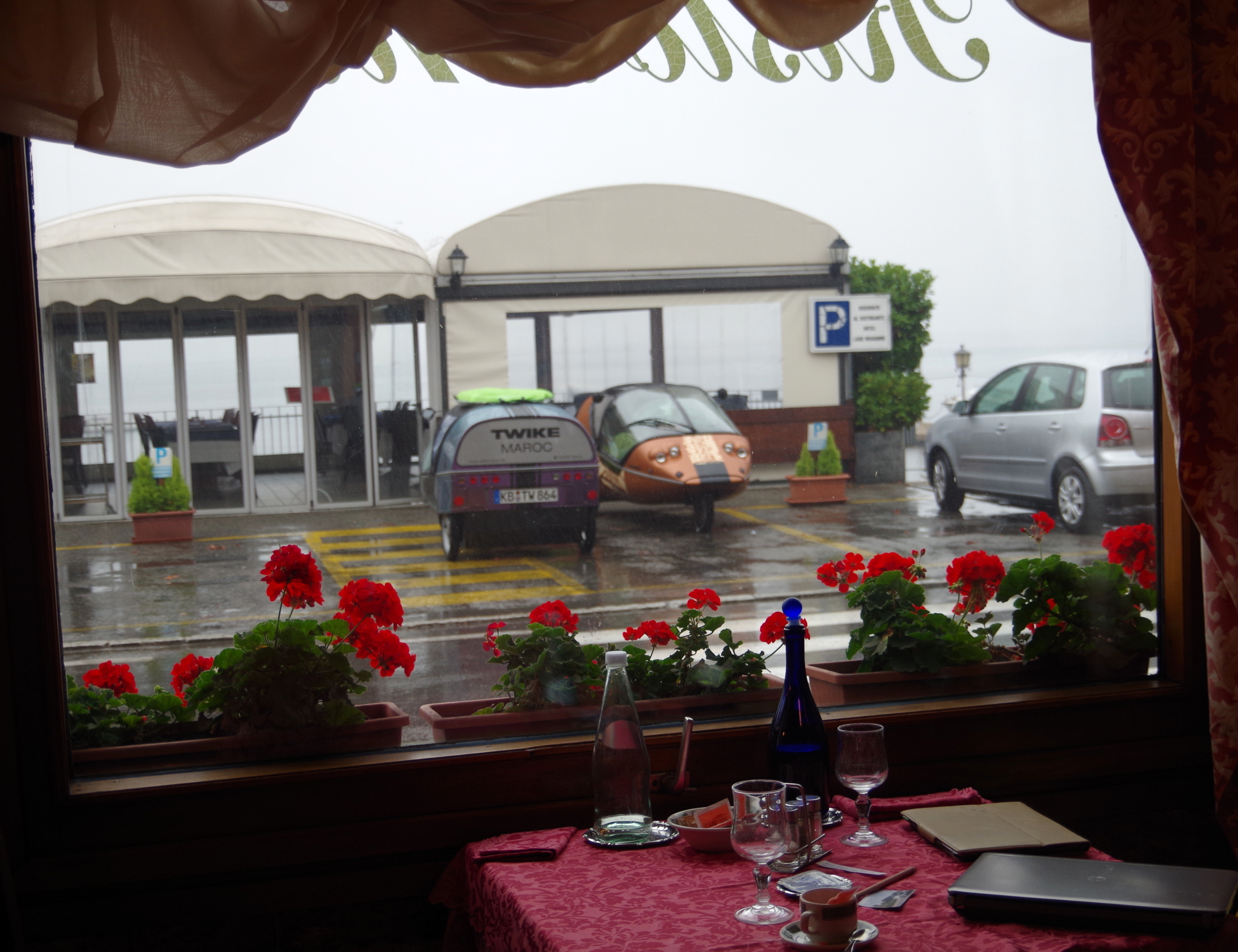 Wir sind definitiv in Italien. Das bemerken wir bereits am Frühstückstisch. Anstatt wie noch in der Schweiz mit frischen Brötchen und einer großen Käsetheke verwöhnt, fällt das Frühstück in den Südländern etwas spärlicher und vor allem viel süßer aus. Wir stehen uns knapp ausgedrückt einer Kuchentheke gegenüber. Das Wetterklischee scheint aber nicht anwendbar zu sein. Wir werden erneut vom Regen „verwöhnt“.